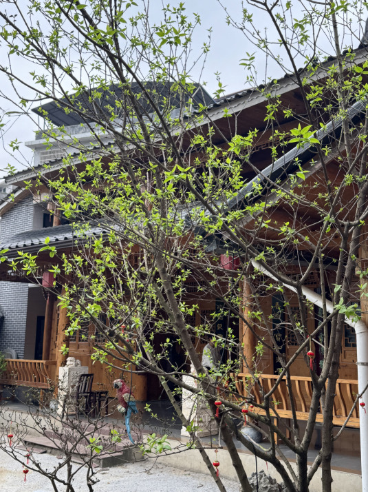 久雨初晴,春日融和,烟光淡荡,草木葳蕤。余于借园中沐日赏景,忽见蜡梅新叶葱茏,枝头更缀青实,其果与叶并生,迥非寻常花木先花后果之态。静观之余,叹造化之妙,又念其徒具果形,而无果肉,既不能食,亦未可观,更无清芬,徒耗养分,有碍新枝萌发、花芽分化,恐损冬花之繁盛与香韵也。