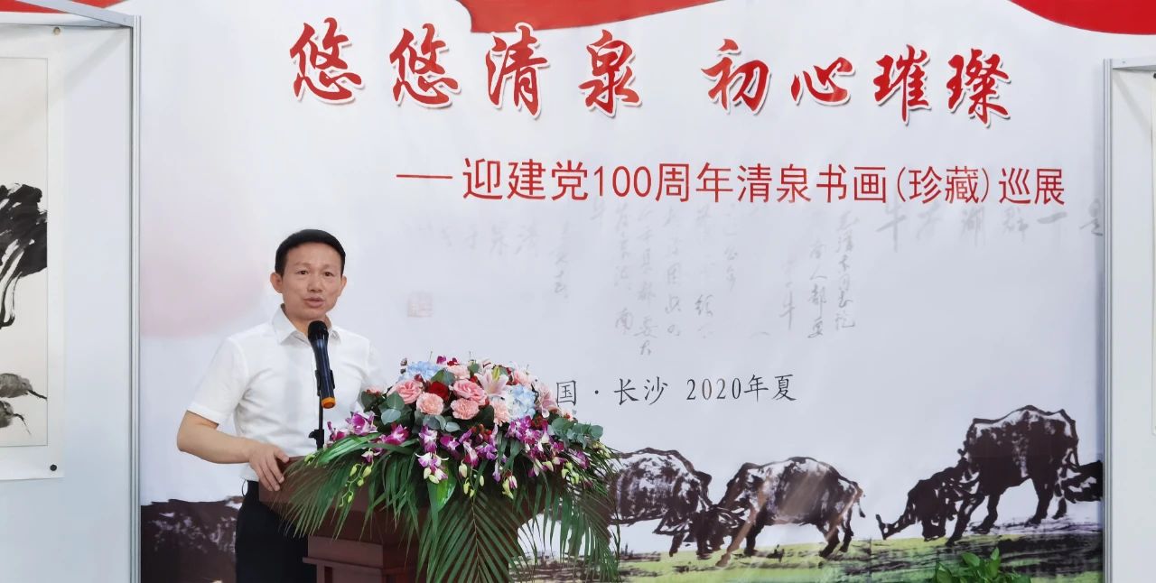 七月流火,八月未央。在这烈日炎炎、骄阳似火的日子里,我们欢聚一堂,共同参加由清泉讲习堂和湖南清泉书画研究院共同主办的《悠悠清泉 初心璀璨——迎建党100周年清泉书画(珍藏)巡展》开幕式,我谨代表湖南清泉书画研究院、清泉讲席堂等单位全体同仁,对各位领导、各位嘉宾、各位朋友的光临指导,表示最热烈的欢迎和最诚挚的感谢。